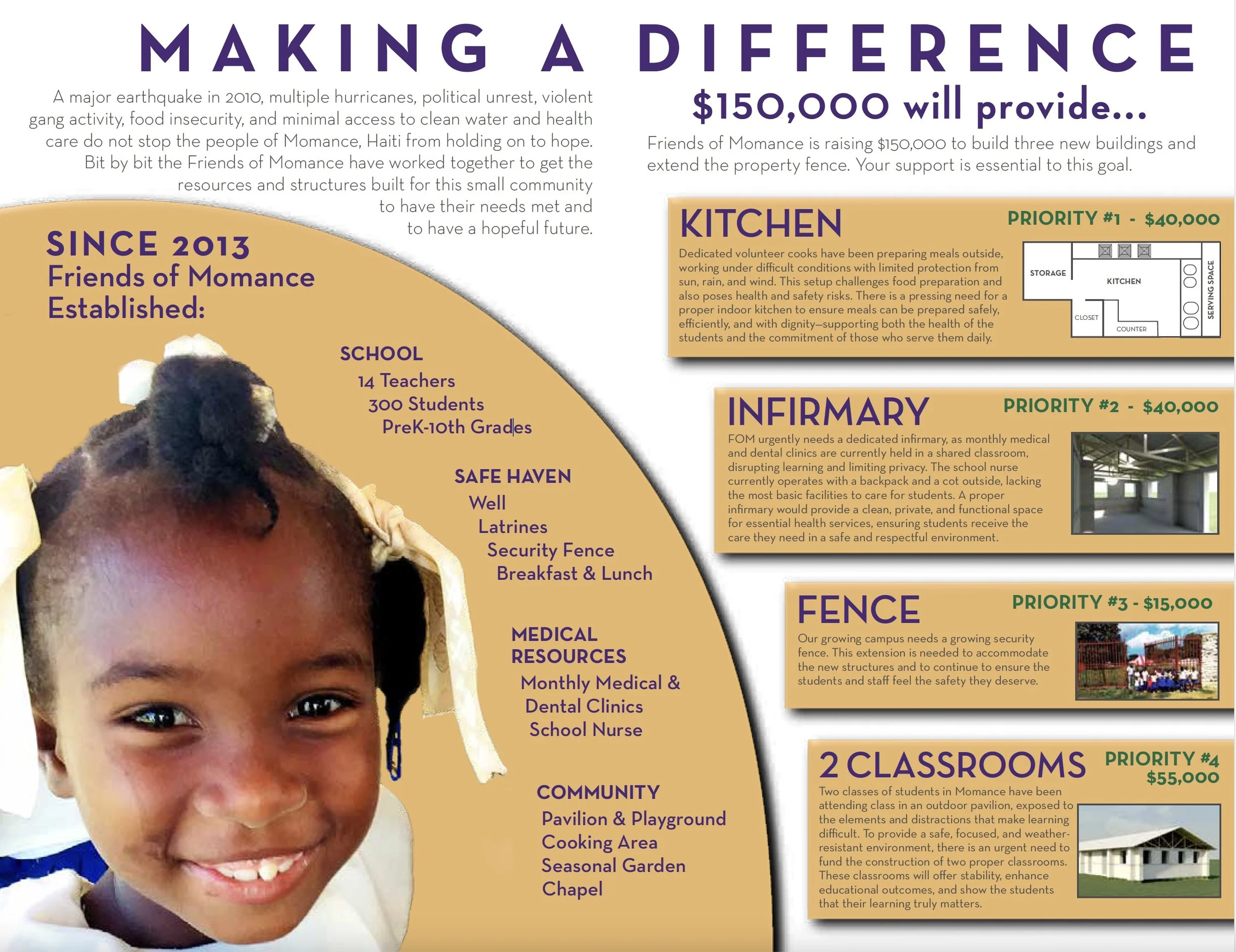 While gangs are tearing down structures and families are destroyed in areas of Haiti, we are still able to continue to build up the community of Momance. Currently, three hundred children are counting on us for breakfast and lunch each day. Our volunteer cooks prepare the meals under the shade of a mango tree. They need and deserve an indoor kitchen to protect the food, cooking equipment and themselves from the weather and creatures. We want to give them a place to prepare, cook, and serve meals out of the elements.